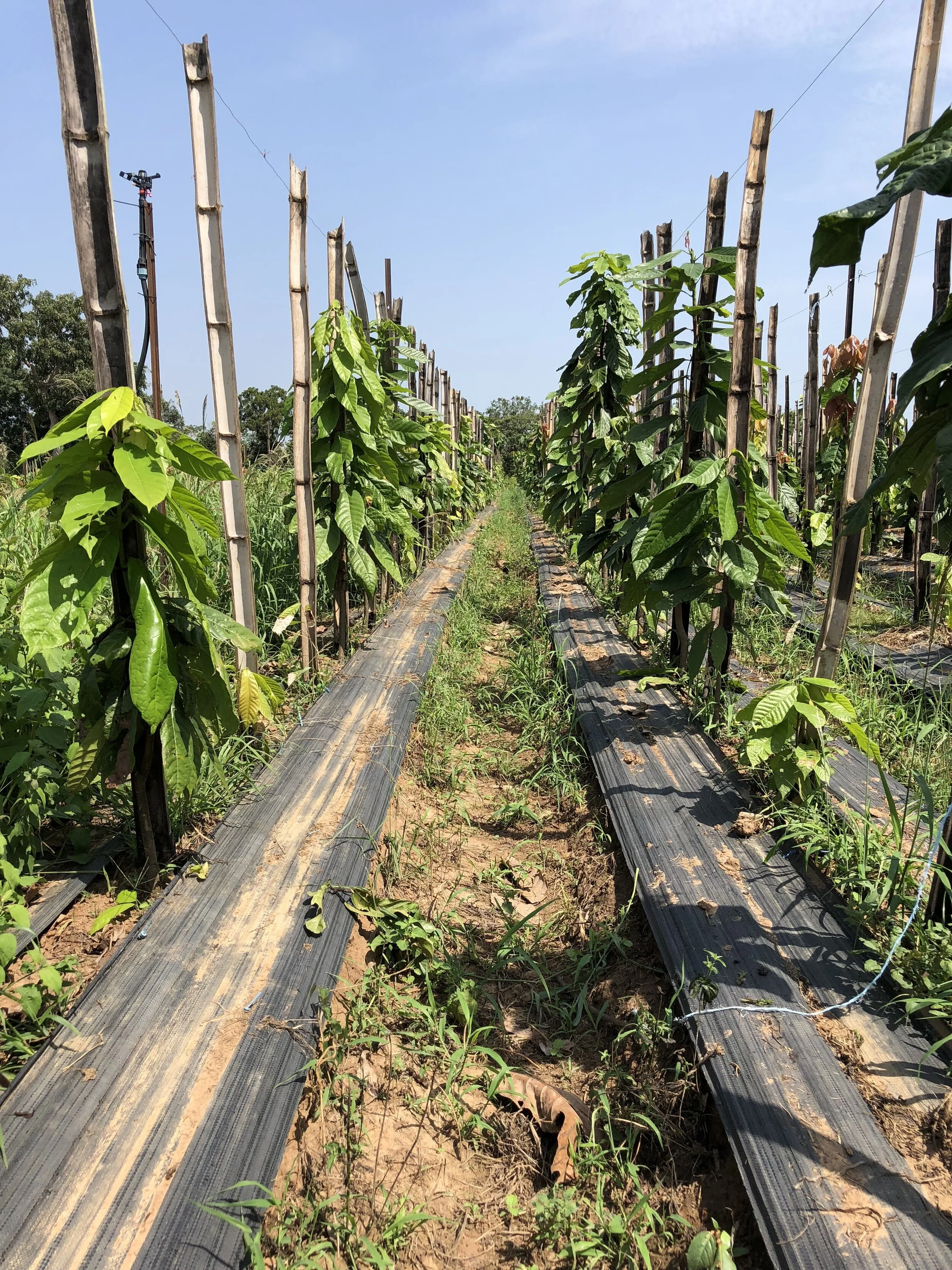 We have been experimenting with intensive cocoa farming protocols using pruning, grafting, organic fertilizers and precision irrigation. Result is the usage of lesser land for similar tonnage, a potential answer to continued deforestation. The trees are starting to bear fruit and we hope to graft the unresponsive ones #kkointernational #cocoa #innovation #irrigation #ivorycoast #farming #organic #deforestation